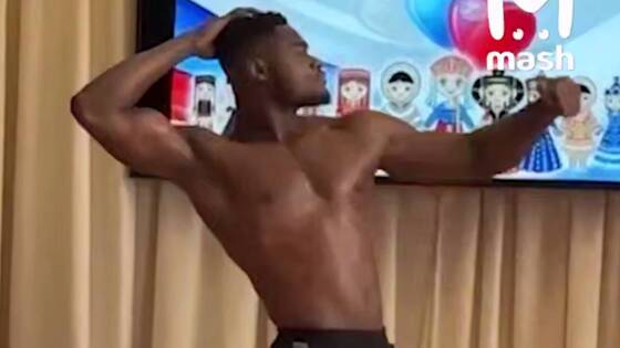 На кадрах уроженец Уганды позирует на фоне телевизора, на экран которого выведено изображение, напоминающее о празднике, отмечаемом 4 ноября. Темнокожий мужчина проводит рукой по прессу, затем показывает свои мускулы.
