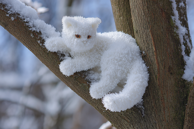 найдите подходящее дерево — лучше всего подойдет высокое, с темным и ровным стволом; прилепите снег в форме кошки, начните с округлой головы с ушами; под головой слепите туловище — овальное, продолговатое; теперь слепите четыре расставленные в разные стороны лапы, они должны быть довольно длинными; не забудьте про хвост — его можно сделать немного закругленным.