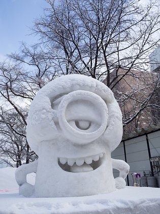 слепите большой снежный ком продолговатой формы, прикрепите к нему руки и ноги; сверху вставьте несколько тонких палочек — это его волосы; в верхней части кома — на лице миньона — сделайте очки или монокль, их можно аккуратно нарисовать черной краской или сделать контуры с помощью веточки (не забудьте нарисовать глаза за очками); нарисуйте улыбку и зубы; сделайте руки — воткните примерно в середину снежного кома две веточки и облепите влажным снегом, чтобы сделать их объемными; слепите ноги — два небольших продолговатых снежка в нижней части снежной фигуры. веточкой сделайте контуры комбинезона на теле миньона; при желании можно раскрасить его синим цветом, а само тело мультяшки — желтым, ноги в таком случае сделайте черными, тем же цветом можно нарисовать перчатки на кончиках рук.