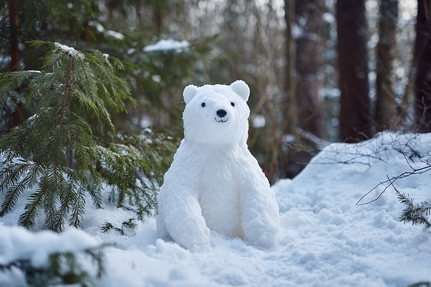 сделайте большой снежный ком, сверху прикрепите поменьше; на маленьком выделите морду и длинный нос, прилепите уши; закрепите на кончике носа черный камень; глаза медведю можно сделать из камней, угольков или пуговиц; прикрепите к туловищу медведя лапы; передние можно сделать опущенными по бокам, для этого нужно прикрепить снег прямо к туловищу в форме вытянутых полуовалов, а задние лапы нужно прилепить к фигуре так, будто медведь сел и вытянул их вперед — для этого нужно слепить два продолговатых снежных кома и к концу каждого прикрепить небольшие овальные снежки — стопы зверя; отшлифуйте снег, придайте лапам нужную форму, при желании раскрасьте медведя — вам понадобятся черная и коричневая краски.