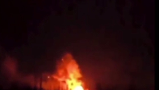 Налет "Гераней" из окна квартиры запечатлели, вероятно, муж с женой. Судя по мощным взрывам, сопровождающимся голубыми вспышками, характерными для короткого замыкания, беспилотники поразили ТЭЦ.