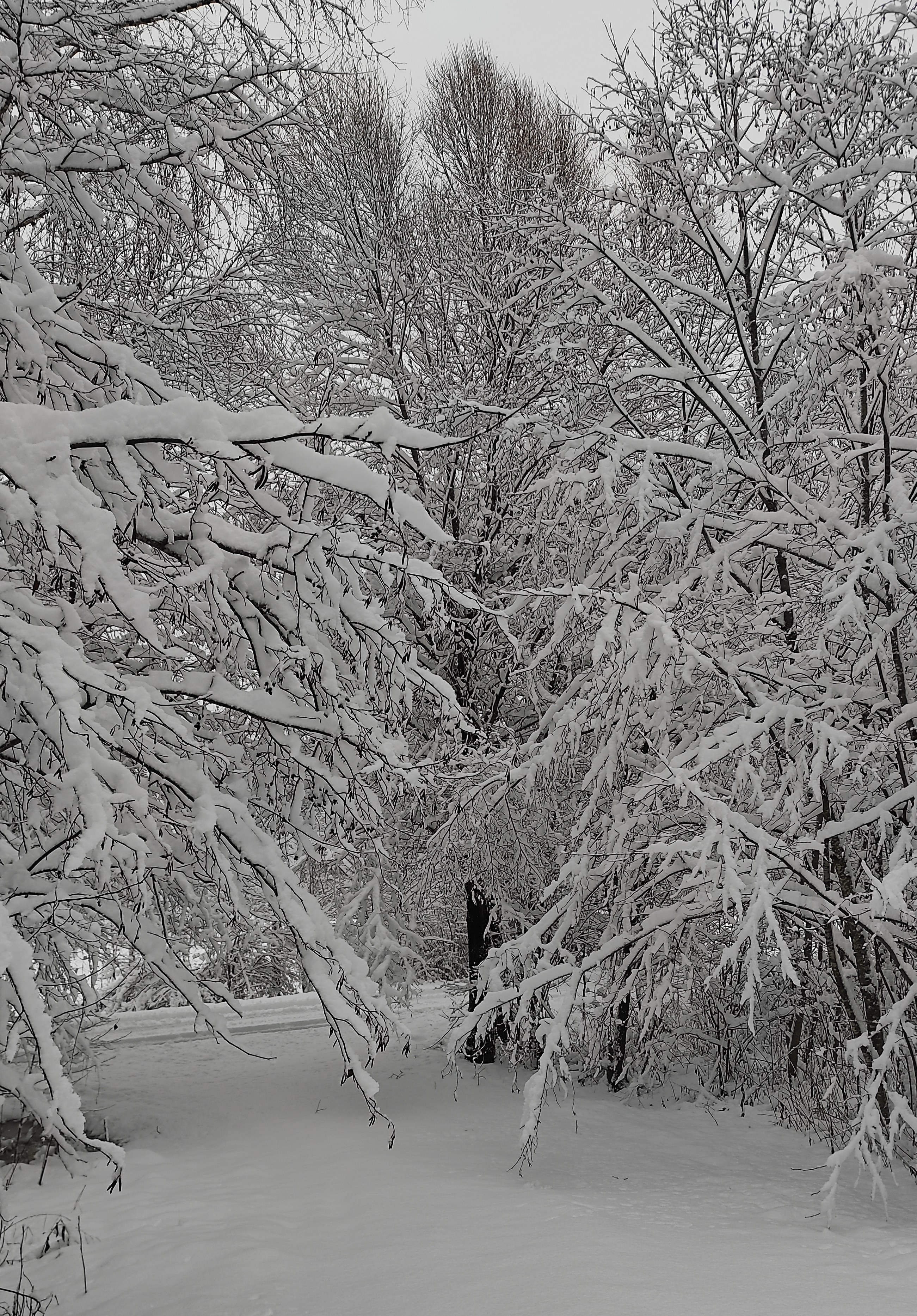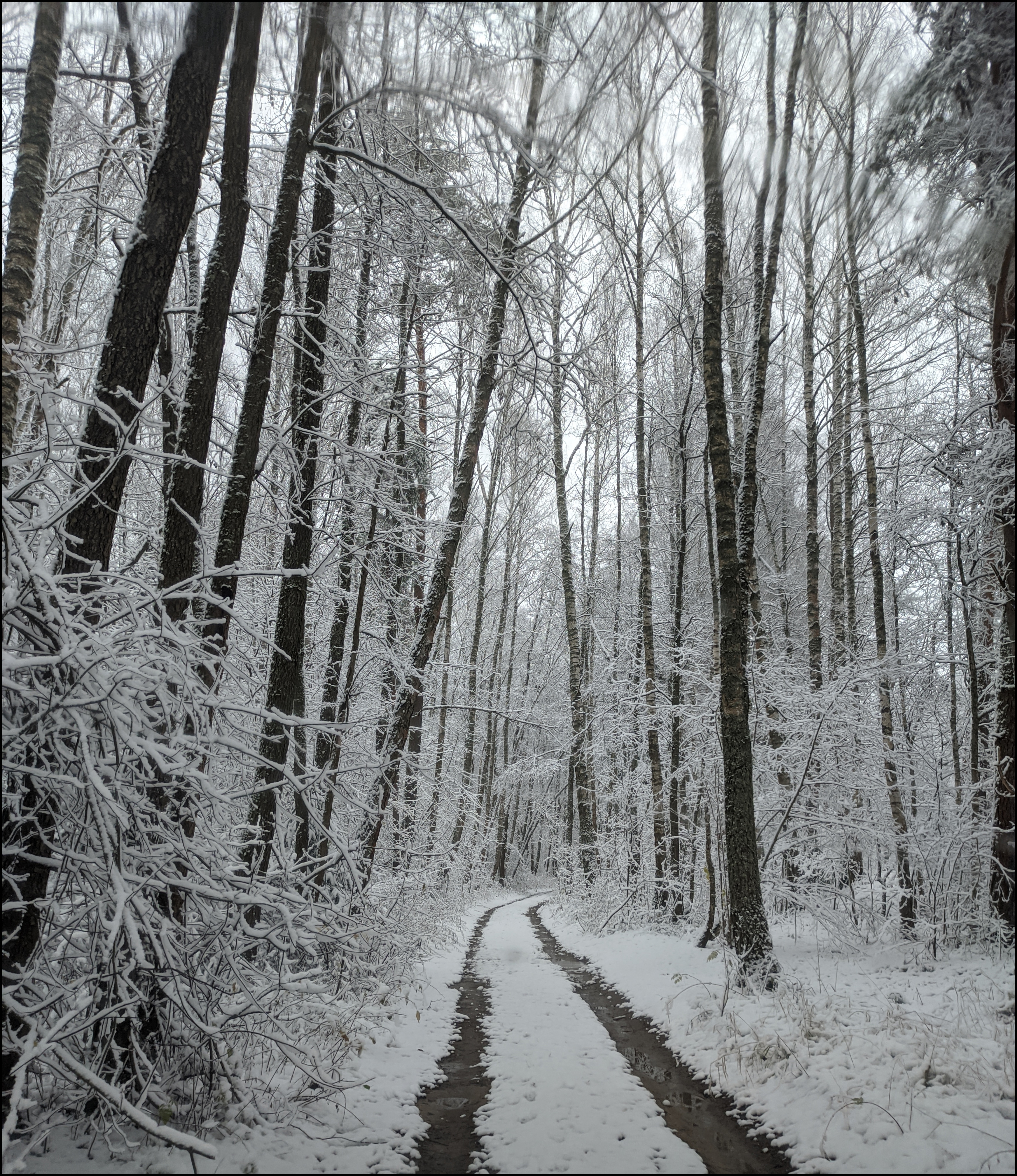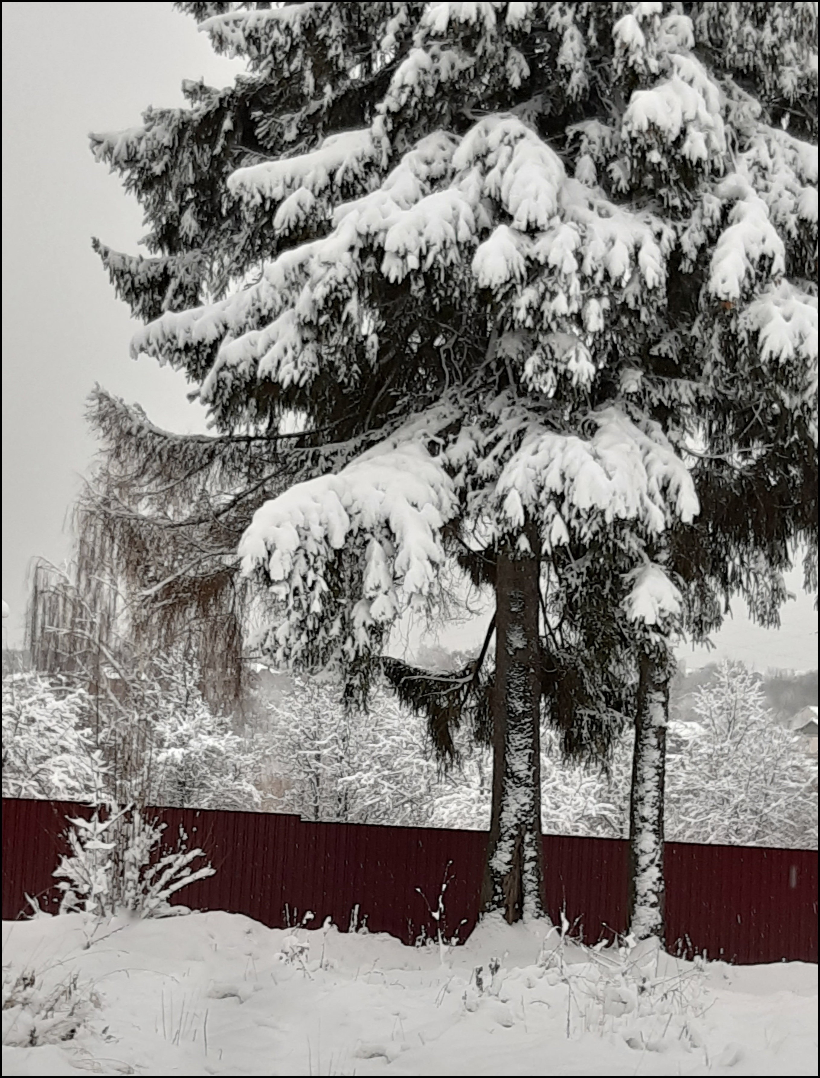 Если мы просто отрежем этот дом, который своей массой перегружает левую часть, притягивает к себе взгляд,— сразу ничто не будет мешать нам видеть и эти прекрасные запорошенные деревья, и увидим правее их запорошенную крышу домика. Мы не замечали его на исходном фото, так как взгляд тянуло на себя жёлтое пятно слева...