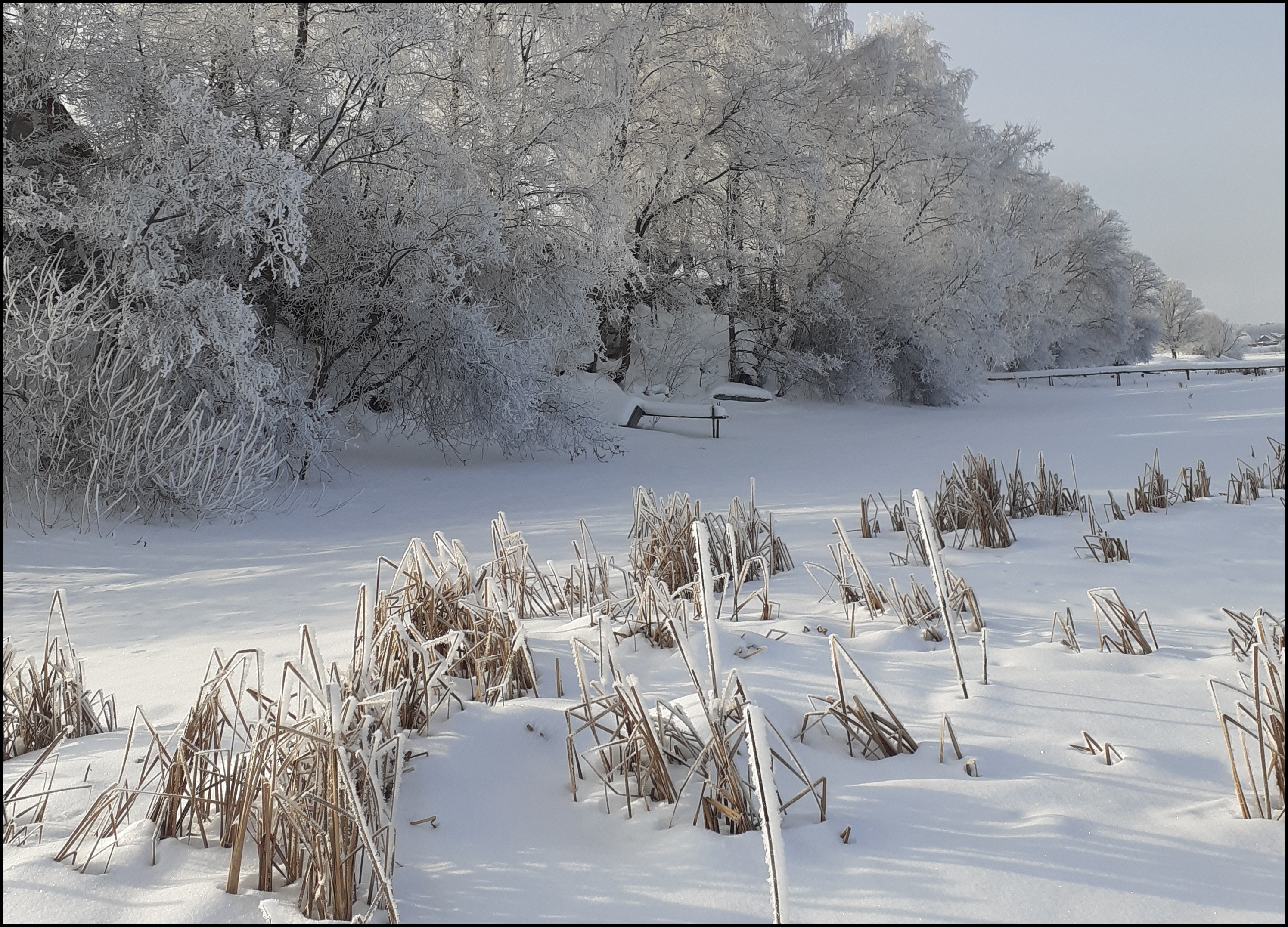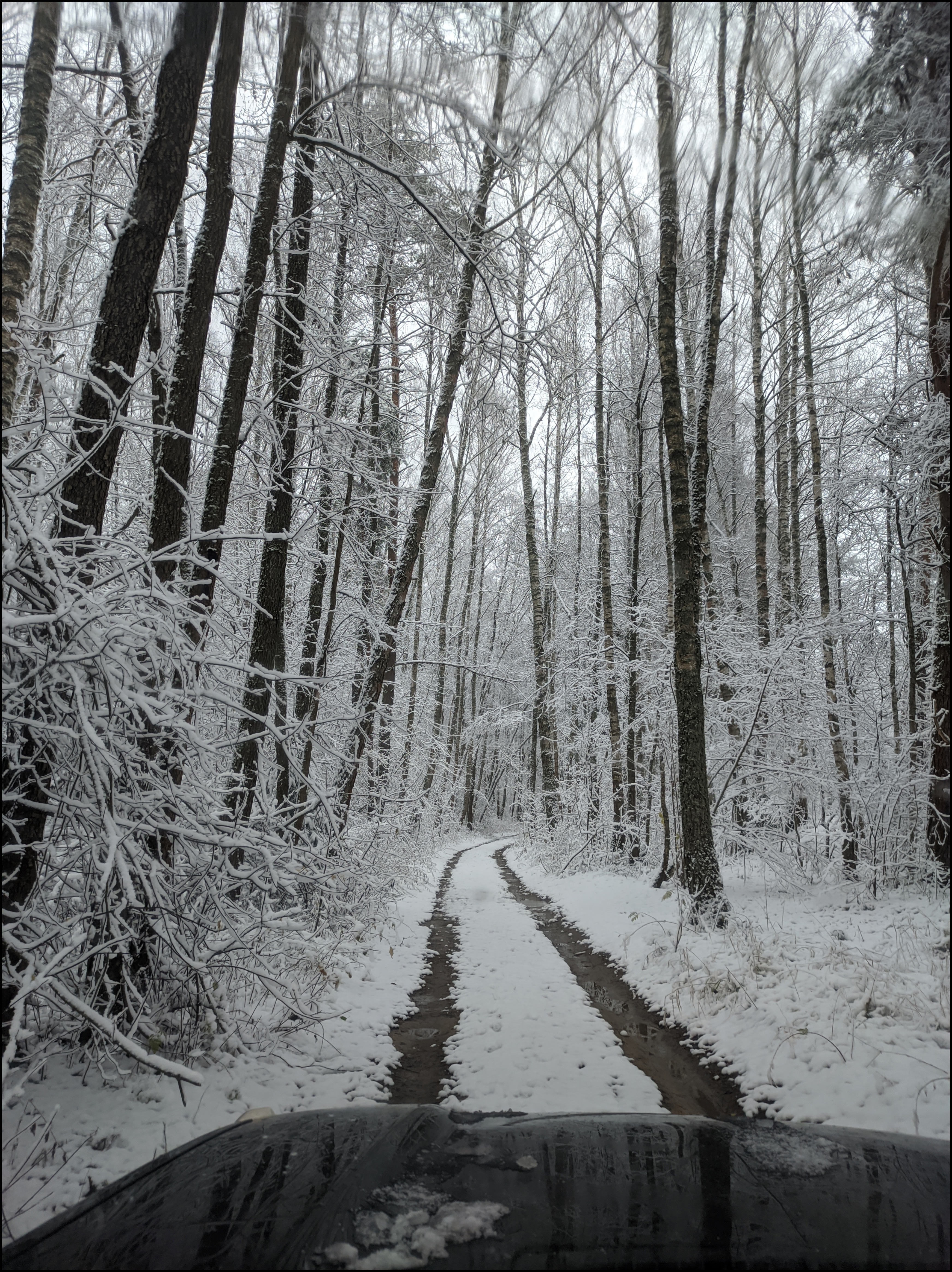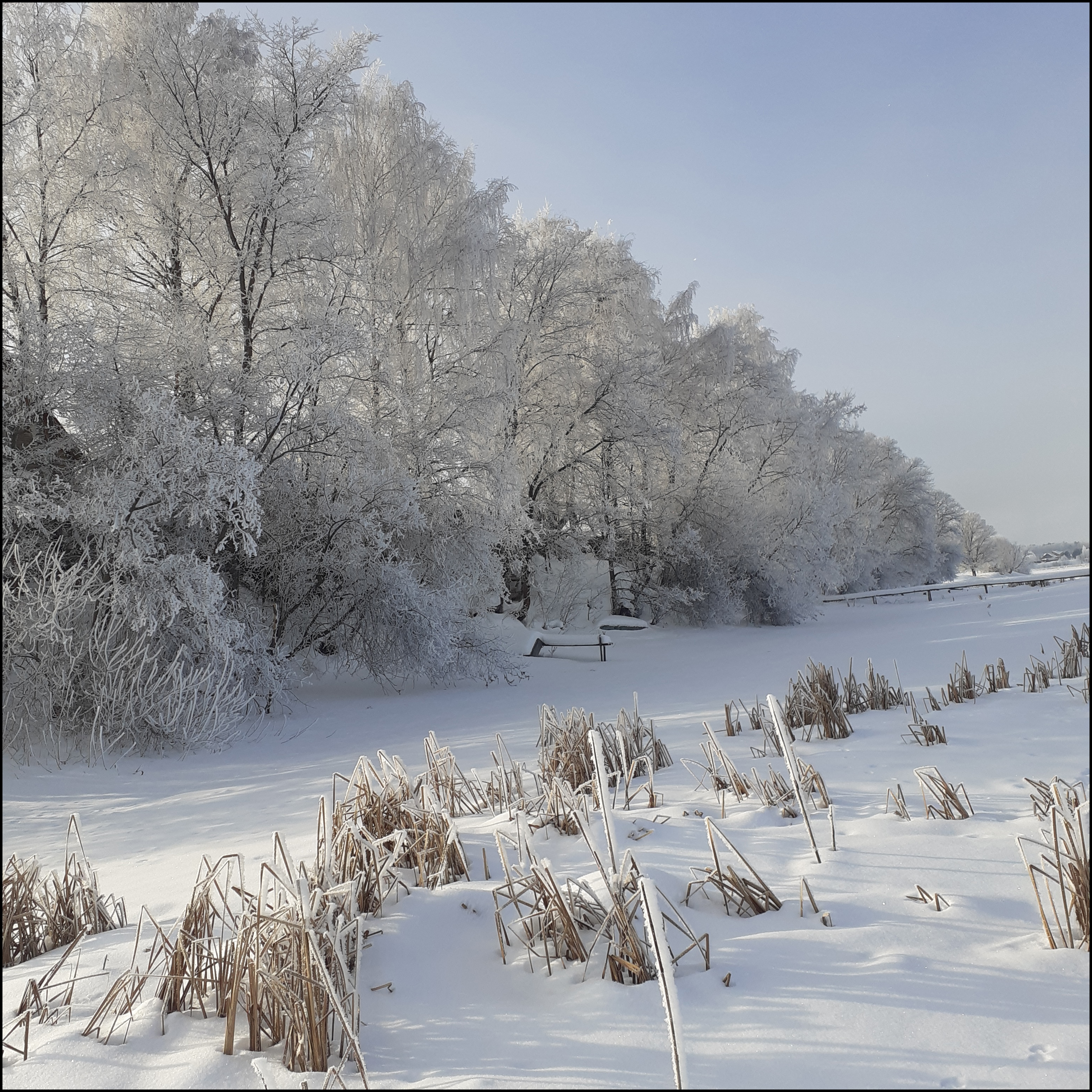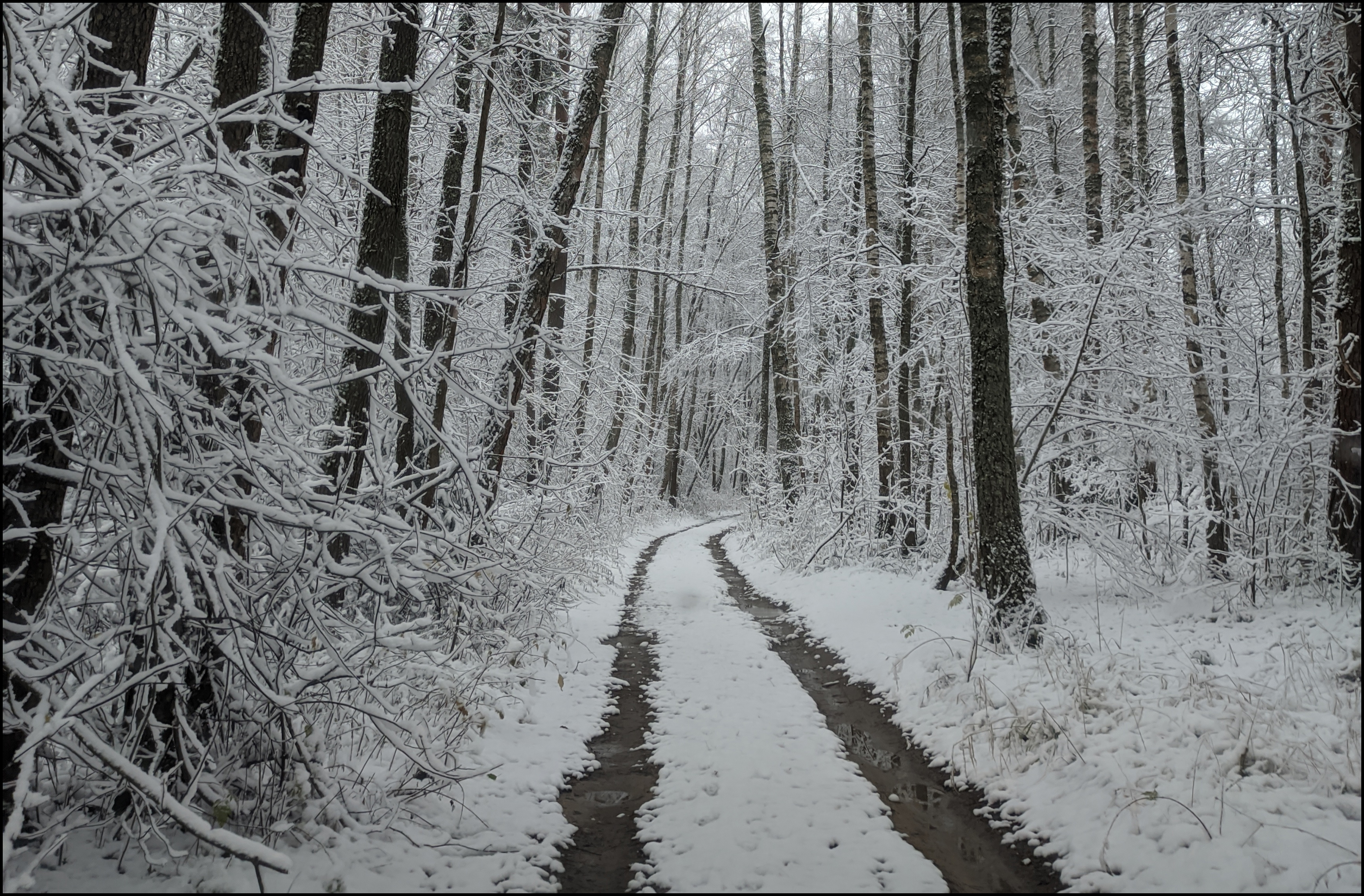 Если мы просто отрежем этот дом, который своей массой перегружает левую часть, притягивает к себе взгляд,— сразу ничто не будет мешать нам видеть и эти прекрасные запорошенные деревья, и увидим правее их запорошенную крышу домика. Мы не замечали его на исходном фото, так как взгляд тянуло на себя жёлтое пятно слева...