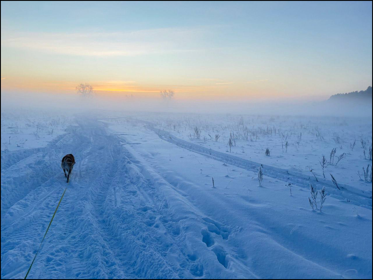 Можно было при съёмке чуть повернуть камеру влево — ушел бы массив у горизонта справа, и пространство выглядело бы безграничным, а пёс шел бы на край света. ..
