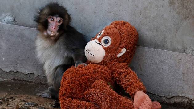 Отвергнутый стаей детеныш макаки нашел утешение в плюшевой игрушке