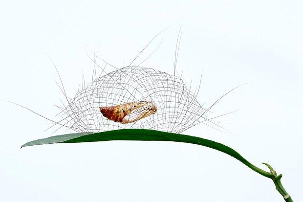 Золото в категории «Поведение беспозвоночных» получил китайский фотограф Минхуэй Юань. Он запечатлел личинку мешочницы в тропическом лесу Сишуанбаньна на юге Китая. Насекомое строило защитное гнездо из собственных ядовитых волосков на молодых листьях растения.