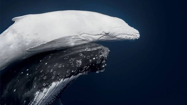 На фотографии Джоно Аллена запечатлен китенок по имени Махина — это слово на тонганском языке означает «луна». Аллен снял его в тропических водах архипелага Вавау в Тонга, когда детеныш плыл рядом со своей матерью. Это редчайший кадр: альбиносом рождается лишь один из 40 тысяч горбатых китов.