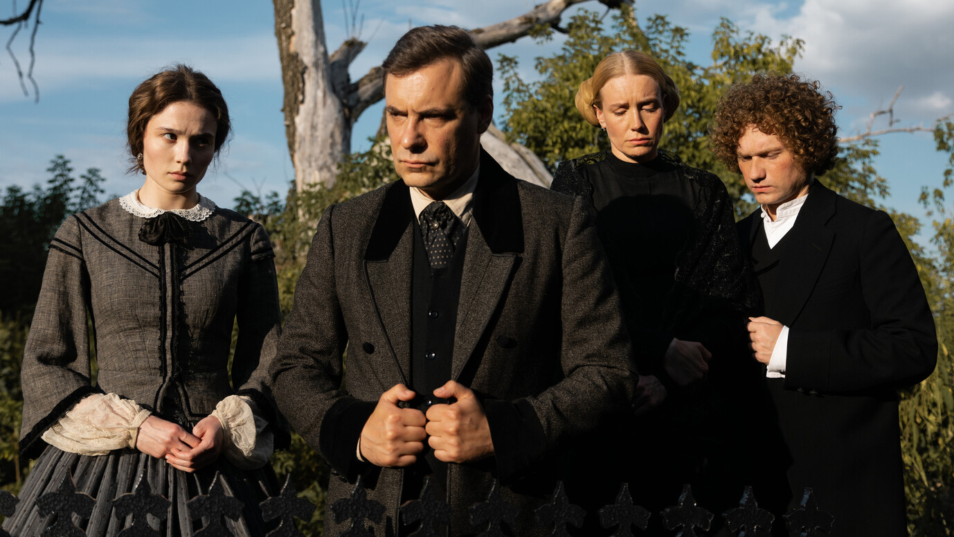 Евгений Цыганов, получивший за роль Сергей Михайловича приз Московского международного кинофестиваля — 2025 как лучший актёр, показательно иллюстрирует, как любовь может настигнуть и подростка, и взрослого человека. Он органично выглядит и в рубахе с жилетом, и во фраке, терпеливо успокаивая волнения юной супруги, пока они лучше узнают друг друга. Что не мешает ему аккуратно обходить в разговорах некоторые свои тайны прошлого — а они по законам жанра станут известны и повлияют на всех действующих лиц.