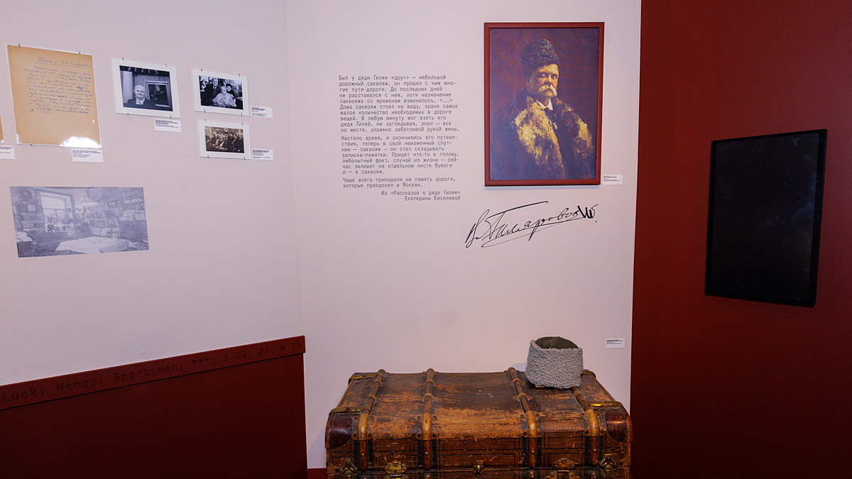 Выставка в Центре Гиляровского приурочена к 170-летию со дня рождения писателя. В экспозицию вошли выпуски газет под редактурой Гиляровского, его стихи и письма, редкие фотографии с Антоном Чеховым. Здесь также можно увидеть портреты писателя, его дочери Надежды и зятя Виктора Лобанова, созданные художником Александром Герасимовым, акварельный портрет Гиляровского авторства Сергея Ягужинского и иллюстрации художницы Полины Парыгиной, в которых переосмыслены жизнь и творчество автора «Москвы и москвичей».