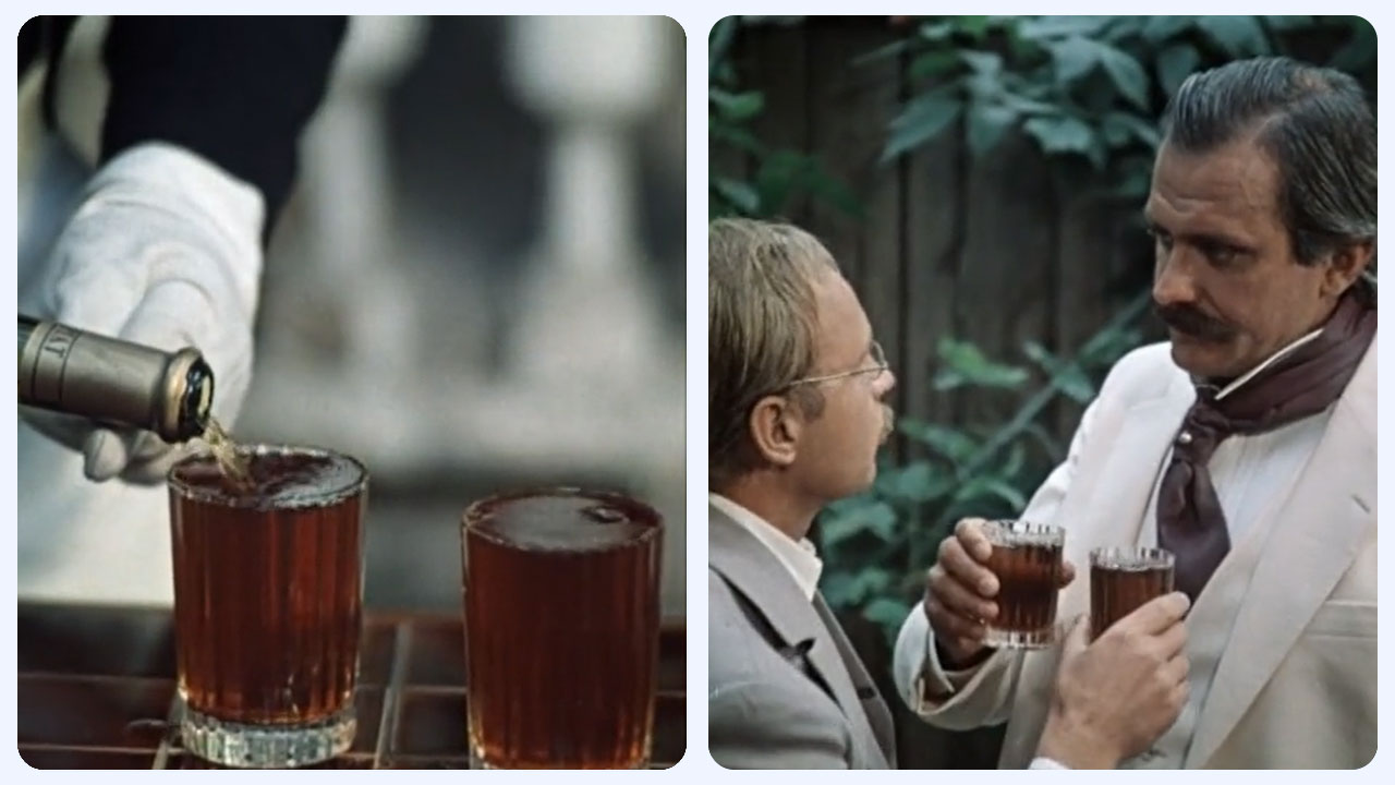 Званый ужин в доме Карандышева в честь его помолвки с Ларисой. Паратов предлагает Карандышеву выпить на брудершафт. Слуга наливает коньяк в стаканы до краёв. Но когда герои берут стаканы в руки, уровень коньяка в них значительно уменьшается.