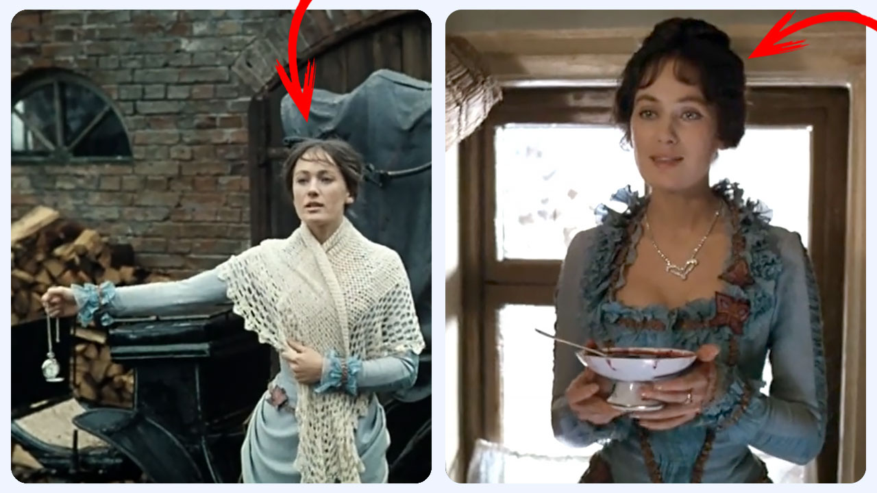Тот же эпизод — день рождения Ларисы. Гости выходят на улицу. Лариса держит часы, чтобы Паратов выстрелом выбил их из её руки. При этом волосы девушки заметно растрепались. Но когда она через несколько секунд оказывается в доме, они снова уложены в аккуратную прическу.