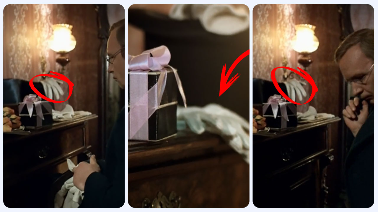 День рождения Ларисы Огудаловой. Оскорблённый невниманием девушки Юлий Карандышев уходит с вечеринки: в коридоре он обращает внимание на то, то именинница так и не распаковала его подарок. При этом хорошо видно, что белые перчатки лежат на большой коробке над подарком. Но уже в следующем кадре, при съёмке крупным планом, перчатки лежат рядом с ним. А в следующем кадре они снова наверху.