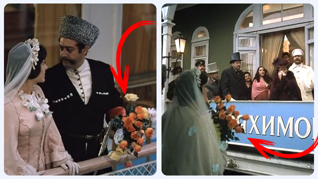 Гости на пристани провожают молодожёнов. Паратов бросает невесте цветы, но ревнивый князь тут же их вырывает. Но через несколько секунд, при смене ракурса, цветы вновь у невесты.