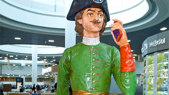 В петербургском аэропорту Пулково была установлена скульптура, изображающая императора Петра I в образе современного авиапассажира. Об этом сообщается в официальном блоге аэропорта. Фигура царя, одетого в кафтан и черную треуголку, и держащего в одной руке современный смартфон, а в другой — чемодан, изготовлена из бронзы и раскрашена. Ее высота — 220 сантиметров вместе с основанием — соответствует реальному росту Петра I. Статую, установленную в помещении пассажирского терминала, создал российский скульптор Михаил Дронов. «Мы стремились отразить в аэропорту дух города, его символ и вместе с тем гармонично вписать новый предмет искусства в современные интерьеры обновленного аэропорта. Сложно найти что-то более знаковое для истории города на Неве, чем образ его основателя», — заявил, комментируя появление скульптуры, директор по развитию ООО «Воздушные Ворота Северной Столицы Дмитрий Руденко. По его словам, таким образом управляющая компания аэропорта хочет сделать «подарок нашим пассажирам и Петербургу». Ранее в здании аэропорта уже были размещены работы современных петербургских скульпторов и художников. Так, в Пулково есть скульптуры Дмитрия Каминкера и Дмитрия Шорина, картина, написанная при участии музыканта Сергея Шнурова, а в оформлении зала выдачи багажа участвовал Александр Флоренский.