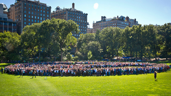 Около двух тысяч жителей Нью-Йорка выстроились в огромный пацифик (символ мира) в Центральном парке. Они посвятили флешмоб 75-летию со дня рождения одного из основателей The Beatles Джона Леннона, которое будет отмечаться 9 октября. Участники акции спели его песню Give Peace a Chance, сообщает Billboard. «Это лучший подарок для Джона», — отметила приглашенная на флешмоб вдова Леннона художница Йоко Оно. Место для проведения акции выбрали не случайно — в 1980 году Леннон был смертельно ранен в подъезде собственного дома напротив западной стороны Центрального парка. Там же Йоко Оно развеяла прах музыканта. Джон Леннон — вокалист, гитарист и автор большинства песен британской группы The Beatles, признанной одним из наиболее успешных музыкальных коллективов XX века. Она была основана в 1960 году и просуществовали до 1970-го. После ухода из The Beatles Леннон записывал свои композиции сольно и с супругой Йоко Оно. Артиста застрелили сразу после интервью американским журналистам, когда он с женой возвращался домой. Виновным признал Марк Чэпмен, которого приговорили к пожизненному заключению.