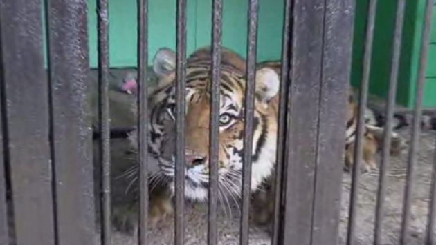Взрослый тигр по кличке Шерхан, который вырвался из клетки в кузове машины, бросив там свою самку, после поимки стал вегетарианцем. В течение трех дней хищник пьет только воду, отказывается от еды и никак не реагирует на сотрудников воронежского зоопарка, которые радушно приняли его после побега при транспортировке из подмосковного зоопарка «Планета обезьян» в Карачаево-Черкесию. Специалисты объясняют поведение хищника сильным стрессом, который ему пришлось перенести за небольшой промежуток времени: тут и перевозка в тесной клетке, и побег, и погоня, а также действие успокоительного, из-за которого Шерхан был обездвижен почти полдня. Интересно, что его подруга, которую перевозили в том же грузовике, в отличие от своего товарища по несчастью, ест с аппетитом, проявляет активность и ведет себя агрессивно. - Тигр и тигрица живут в отдельных в клетках, так что они между собой не общаются. Посетителей к ним не пускают. Но поведение самца объяснимо скорее стрессом от пережитого, чем тоской по подруге, - рассказали LifeNews в Воронежском зоопарке. Напомним, сегодня, 7 февраля, очевидцы сообщили полицейским и спасателям о полосатом хищнике, который гулял по улицам города. Животное удалось заблокировать, а затем усыпить. Двух четырёхлетних хищников перевозили в тесной деревянной клетке в «газели». Животные не могли не то, что подвигаться, но даже полноценно встать. Не исключено, что между животными случился раздор. Также возможно, что тигр сбежал из-за тяжелых условий, в которых его перевозили. В настоящее время он находится в местном зоопарке. Его отказываются возвращать перевозчику из-за отсутствия необходимых документов.