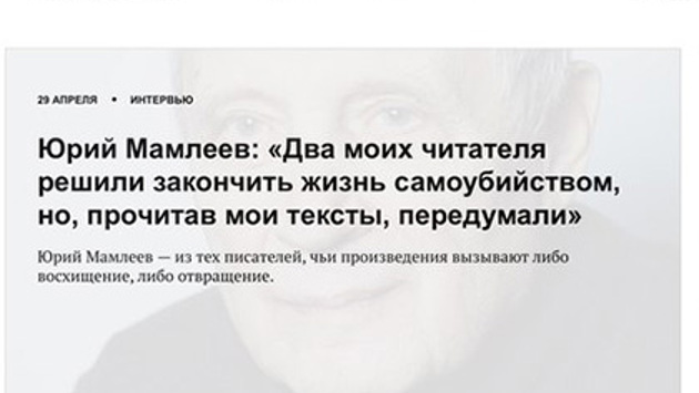 Белорусский интернет-журнал «Большой» опубликовал интервью с писателем Юрием Мамлеевым, который умер в октябре 2015 года. Об этом сообщил пользователь «ВКонтакте» Александр Галенок, добавив скриншот главной страницы сайта. По его словам, автор интервью написал, что у литератора все хорошо и он пишет новую книгу. Когда Галенок оставил комментарий под статьей, ее удалили. «Всякое в жизни видел, но такое впервые. Издание существуют в виде журнала и сайта, популярности особой нет, но бывали интересные вещи. Здесь ведет колонку Саша Филипенко, часто разные интервью появлялись. Теперь я понял, они фейковые интервью и раньше делали!» — отметил Галенок. Один из пользователей «ВКонтакте» пояснил, что это онлайн-версия интервью 2013 года. Другой сообщил, что не успел прокомментировать статью, так как ее быстро сняли с публикации. Лауреат литературной премии Андрея Белого и член Союза писателей Юрий Мамлеев скончался 25 октября. Его называют основоположником литературного течения «метафизический реализм». Произведения писателя переведены на многие европейские языки. Большой интерес во всем мире вызывает философская доктрина Мамлеева «Вечная Россия». Среди его самых известных литературных работ — романы «Шатуны», «Другой», «Мир и хохот», «Крылья ужаса» и «Блуждающее время».