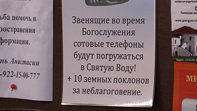 Священники Успенского собора Екатеринбурга придумали новый способ борьбы со звонящими во время службы мобильными телефонами. Об этом в четверг, 25 августа, сообщает «Наша газета». «Звенящие во время Богослужения сотовые телефоны будут погружаться в Святую Воду! +10 земных поклонов за неблагоговение», — гласит текст объявления, появившегося у входа в собор. По словам служащей церкви, она не видела, чтобы телефоны окунали в святую воду, но «знает точно» про 10 земных поклонов. Если у кого-то из прихожан во время службы звонит телефон, то, с одобрения священника, церковный староста говорит провинившемуся: «Вам батюшка благословил 10 поклонов». Как отметила служащая, «человек церковный» выполнит послушание. Как поясняет портал «Вера православная», при совершении земного поклона молящийся должен встать на колени и коснуться пола лбом и руками. В том случае, если надо сделать несколько поклонов, необходимо вставать в полный рост после каждого из них.