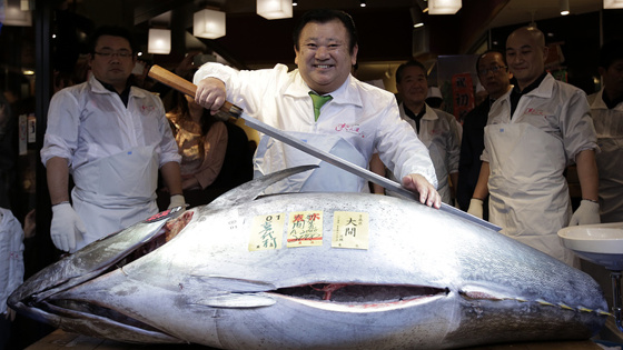 Голубой тунец весом 212 кг, являющийся главным лотом рыбного аукциона на известном токийском рынке морепродуктов Цукидзи, продан на первых в этом году торгах за 74,2 млн иен (около $634 тыс.). Об этом сообщили организаторы аукциона. Ушедшая с молотка рыба по самой высокой за день цене была выловлена в водах Тихого океана в районе порта Ома (префектура Аомори). Четвертый год подряд покупателем стал владелец крупной токийской сети ресторанов, в которых подают суси, Киёси Кимура, известный игрок на рыбном рынке Токио. "Немного дороговато, но я рад, что смог купить такого хорошего по форме и размеру тунца. Хочу поскорее накормить им своих посетителей", - сказал он по итогам аукциона. Абсолютный рекорд стоимости на торгах был установлен в 2013 году, когда 222-килограммовый голубой тунец был продан за 155,4 млн иен ($1,75 млн по курсу на тот момент). Борьба за самого крупного голубого тунца на первых в году рыбных торгах в Цукидзи является ежегодной забавой для элиты токийских рестораторов.