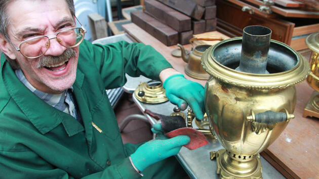 Муниципальный депутат, директор досугового центра «Орбита» района Замоскворечье Алексей Елистратов — коллекционер. Он собирает самовары, которые покупает на столичных блошиных рынках, а потом реставрирует. «ВМ» напросилась в гости к народному умельцу. Начищенные до блеска самовары разных форм и размеров аккуратно расставлены на полках в квартире коллекционера. Здесь и ≪рюмочки≫, и ≪шары≫, и ≪вазы≫. Одни чуть изящнее и выше, другие проще и миниатюрнее. Но каждый из них сияет как новый, а ведь многие модели относятся к дореволюционному периоду. Коллекционировать самовары Алексей Елистратов начал 10 лет назад. Причем свое первое приобретение он сделал случайно. — В районе проводили Масленицу, — вспоминает депутат. — Обычно мы накрывали стол с блинами и чаем, который разливали по термосам и чайникам. Как-то неэстетично, согласитесь. И я решил — эта Масленица, на которую мы тогда пригласили много гостей, будет особенной. Алексей отправился на блошиный рынок , где купил недорогой самовар с небольшими вмятинами по принципу — чем больше, тем лучше. Уже через несколько часов его было не узнать: идеально гладкие бока ярко сверкали на электрическом свету. Правда, одного самовара на всех не хватило, поэтому к следующей Масленице депутату опять пришлось ехать на блошиный рынок. На этот раз он отнесся к выбору гораздо серьезнее и вернулся домой с самоваром нестандартной формы еще дореволюционного периода. Единственный минус — тот был сильно деформирован. Но Алексея Елистратова это не смутило. — Я всегда любил делать что-то своими руками — рамки для фотографий, книжные полки, — рассказывает мужчина. — С самоварами, конечно, дело обстоит сложнее, но я справляюсь. Труднее всего реставрировать фигурные самовары: при помощи обычного молотка и деревянных формочек приходится по несколько часов в день выпрямлять вмятины, а потом полировать поверхность при помощи вой лочной тряпочки. Сейчас на рынке можно приобрести большое количество специальных инструментов, но многие из них стоят дороже самого предмета, который реставрируешь, признается Алексей. Это невыгодно. Обычно он покупает самовары по 3–7 тысяч рублей, которые, как правило, были изготовлены на фабриках Баташевых или Воронцовых. После реставрации их стоимость увеличивается. Так, сейчас цена самого дешевого предмета в коллекции мужчины, которая насчитывает более 50 самоваров, достигает 25 тысяч рублей. Вообще же стоимость самоваров дореволюционных времен, которые делали кустарно, может доходить до полумиллиона. Но узнать, к какому периоду относится предмет, не так-то просто. — В царской России самовары либо датировали, либо клеймили. Но потом перестали это делать изза их массового производства,— поясняет Алексей. — Однако настоящие профессионалы могут определить возраст предмета с интервалом от одного года до пяти лет исключительно по его внешнему виду. Я пока таких высот не достиг, но, надеюсь, со временем тоже смогу угадывать примерный год их производства. Коллекционировать самовары для Алексея Елистратова не просто хобби. — Мне хочется, чтобы дети и внуки мною гордились, — улыбается депутат. — Чтобы они могли посмотреть на самовары и сказать: а вот это осталось от папы.