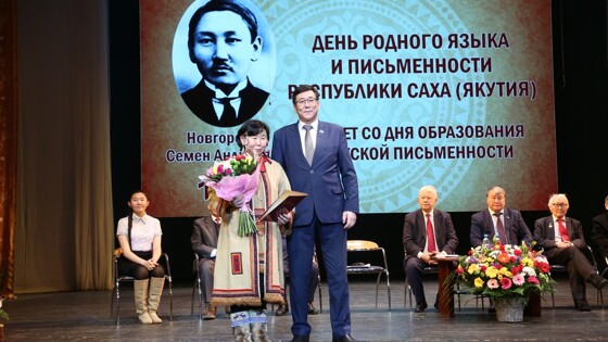 В столице республики состоялось торжественное собрание общественности, посвященное Дню родного языка и письменности и 125-летию со дня рождения первого якутского ученого-лингвиста, создателя якутского алфавита Семена Андреевича Новгородова. На торжественном собрании с основным докладом о жизни и деятельности С.А. Новгородова выступил член Академии наук РС(Я), доктор филологических наук, главный научный сотрудник сектора лексикологии и лексикографии Института гуманитарных исследований и проблем малочисленных народов Севера СО РАН Петр Слепцов. Он отметил, что о выдающемся просветителе Семене Новгородове выпущено немало книг и воспоминаний. Петр Алексеевич подчеркнул, что теперь стоит задача подготовить на их основе научную работу о деятельности и жизненном пути первого якутского ученого-лингвиста, создателя якутского алфавита, автора первых учебников на языке саха. От имени главы и правительства якутян поздравил министр культуры и духовного развития Владимир Тихонов. «К 125-летию Семена Новгородова мы пришли с определенными успехами. За эти 100 лет с момента выхода первого букваря якутяне стали высокообразованным народом. Якутский язык сегодня широко используется во всех сферах деятельности, в том числе в документоведении», — сказал он. 1 из 5 В завершение выступления Владимир Тихонов вручил премии главы Якутии в области сохранения, изучения и развития родных языков, сообщает пресс-служба главы и правительства республики. Премии имени Семена Андреевича Новгородова удостоены учитель якутского языка и литературы Саха гимназии г. Якутска Анна Саввинова и ведущий научный сотрудник Научно-исследовательского института национальных школ РС(Я) Нина Филиппова. Премия имени Николая Ивановича Спиридонова-Тэки Одулока за вклад в сохранение и развитие юкагирского языка вручена члену общественной организации «Ассоциация юкагиров Республики Саха (Якутия)» Пелагее Сентяковой. Премии имени Глафиры Макарьевны Василевич за вклад в сохранение и развитие эвенкийского языка и духовной культуры коренных малочисленных народов Севера удостоена учитель эвенкийского языка и культуры народов РС(Я) средней общеобразовательной школы №7 села Кутана Алданского района Марфа Егорова. На торжественном собрании выступили государственный советник Михаил Николаев, председатель Ил Тумэна Александр Жирков, глава Чурапчинского улуса Андрей Ноговицын, народный писатель Семен Попов – Сэмэн Тумат, президент Ассоциации коренных малочисленных народов РС(Я), народный писатель Андрей Кривошапкин, генеральный директор Национального книжного издательства «Бичик» Август Егоров, студентка Арктического государственного института искусства и культуры Анастасия Алексеева. 1 из 51