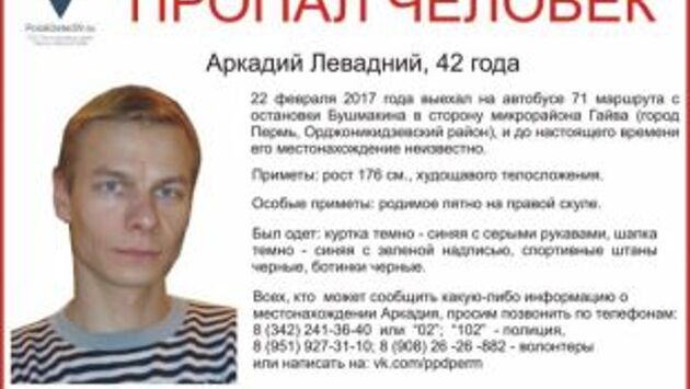 Пермяк Аркадий Левадний 22 февраля сел в 71-й автобус, который ехал в сторону Гайвы. Больше мужчину никто не видел. Родные пропавшего мужчины просят помочь в поисках пропавшего. Известно, что в общественный транспорт Аркадий сел на остановке «улица Бушмакина». Особые приметы пропавшего пермяка: родимое пятно на правой скуле. Мужчина был одет в тёмно-синюю куртку с серыми рукавами, чёрные спортивные штаны, чёрные ботинки и тёмно-синюю шапку с зелёной надписью. Если вы видели этого мужчину, позвоните в полицию.