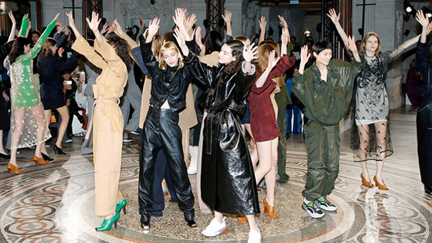 Стелла Маккартни опять в своем репертуаре, а мы только за. В "обязательной программе" - брючные костюмы и пальто, деним и трикотаж, органика и спорт, а в финале - "пробежка" моделей по подиуму. На этот раз - под I gotta have faith Джорджа Майкла. С удовольствием ставим галочки напротив каждого из пунктов, а заодно проходимся по списку ключевых сезонных трендов, который к концу модного марафона стал почти неподъемным. Начнем с главного. Гвоздь подиумной программы в Опера Гарнье - классический приталенный жакет. На этот раз он расчерчивается клеткой, по традиции удлиняется до платья и дружит со свитером с простроченными чашками, шелковыми блузами с воротником-хомутом и трикотажем с принтами с картин Джорджа Стаббса. Потом этот самый жакет теряет рукава, отпуская их в самостоятельное "плавание". И вот они уже существуют сами по себе и, вообще, вполне напоминают болеро, которое придает любому образу офисной собранности. Впрочем, кроссовки на ногах тут же нейтрализуют такой эффект. Кстати, хорошую пару белые сникерсы также составляют и стеганым фуфайкам с шелковыми косынками с узлом на шее, и мотоциклетным курткам, а также болоньевым спортивным костюмам, широким брюкам на высокой талии и кожаным плащам. Последние у дизайнера - убежденной вегетарианки - исключительно из искусственного материала. Зато на подиуме хоть отбавляй органического льна и хлопка. Иначе откуда тут взяться белоснежным кружевам с туфлями-пуантами - идеальными для финальной "пробежки" моделей по подиуму. Как всегда - с танцами и объятиями. Ну чтобы никто не сомневался, что движение - жизнь, что "о спорт, ты - мир", что одежда у Стеллы Маккартни - комфортная и не стесняет движений и что в гигантских кожаных баулах у девочек в руках - только годжи и форма для йоги.
