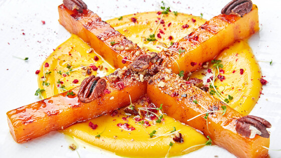 FashionTime.ru продолжает делиться интересными постными предложениями в ресторанах Москвы. В новой части – хинкали, плов, итальянская классика, десерты. Голодно не будет! Постное меню в «Белуге» Томленая тыква с орехами пекан В ресторане русских деликатесов «Белуга» не обошлось без постного меню. Вместо черной икры ставку сделали на первые весенние овощи, сытные каши и нежные десерты. Из лука порея с горчицей делают мусс и соединяют его с жареными белыми грибами, запеченным сельдереем, салатными листьями и трюфельным маслом (540 руб.). Из лепестков редиса, дайкона, моркови, зеленой, желтой и черной репы на огуречном соусе с ворчестером и кориандром складывают салат (340 руб.). Тыкву томят при низкой температуре, нарезают брусками и выкладывают на тыквенное пюре с перцем чили и орехами пекан (310 руб.). На десерт предлагают слоеную апельсиновую улитку с ореховым сорбетом и пралине из нугатина (270 руб.), мильфей из яблочных чипсов и фиалкового крема (420 руб.), и клубничное консоме с миндальным бланманже и мятой (360 руб.). Адрес: ул. Моховая, д. 15/1, стр. 1. постное меню в Brisket BBQЦветная капуста на углях с сальсой, печеным луком-порей и кинзой Во время поста вегетарианцам непременно стоит заглянуть в мясной ресторан Brisket BBQ. Среди постных блюд в меню благодаря стараниям шеф-повара Алексея Каневского появились: салат из копченой свеклы с рукколой и хрустящими баклажанами (420 руб.), початок кукурузы на углях с ароматным маслом (300 руб.), суп-пюре из копченой тыквы с кокосовым молоком (400 руб.), цветная капуста на углях с сальсой, печеным луком-порей и кинзой (450 руб.), стейк из баклажана с рукколой и бальзамической заправкой (420 руб.), гречневая лапша на воке с овощами и соусом из черных бобов (450 руб.). Не обошлось без десерта: попробуйте печеное яблоко с медом, изюмом и орехами с вареньем из черной смородины (350 руб.). Адрес: Смоленский бульвар, д. 15. Постное меню в LITROКрем-суп из лесных грибов Пост – отличная возможность заглянуть в новый гастробар Litro. Шеф-повар Тарас Кириенко приготовил несколько блюд для постящихся: крем-суп из лесных грибов (390 руб.), морковь с булгуром, вешенками и пюре из сельдерея (490 руб.), обжаренные брокколи с цукини и спаржей (680 руб.), запеченная цветная капуста с изюмом и травами (450 руб.). Адрес: ул. Б. Грузинская, д. 69. постное меню в «Жизнь Пи» Постное меню от шефа Раджандара Сингха в ресторане «Жизнь Пи» получилось экзотическим. Судите сами: салат из соевой лапши, грибов, огурцов и помидоров (480 руб.), момо с овощами и грибами (320 руб.), Ведж Патияла с томатным карри (440 руб.). Последнее блюдо – не что иное как роллы из гороховых лепешек, в которые шеф заворачивает обжаренные с пахучими специями болгарский перец, сельдерей, баклажан и морковь. Любителям пряного супа Дал, стоит заказывать именно его (270 руб.). Попробуйте заказать и Бегген Масала (560 руб.), для которого шеф обжаривает баклажаны в пикантных индийских специях, с имбирем и томатным карри. Интересное блюдо и Алу Гоби (370 руб.). Для его приготовления шеф-повар обжаривает беби-картофель, цветную капусту и томаты с луком, имбирем и чесноком в специях Масала. О десертах здесь писать бессмысленно, нужно пробовать. Рецепт Al Gobi (картофель с цветной капустой) Адрес: Саввинская наб., д. 21А, стр. 1. постное меню в «Соседях. Простые радости»Тыквенный суп Если вы завсегдатай «Винного базара» на Комсомольском проспекте, по