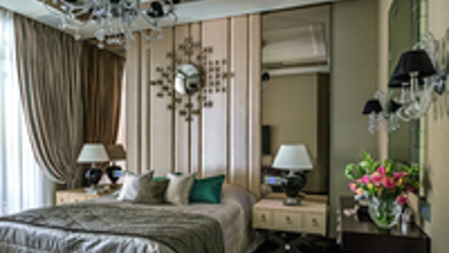 С дизайнерами из архитектурной студии «Альба Дизайн Проект» заказчик был знаком по предыдущим работам. Поэтому, когда встал вопрос выбора специалистов, которые оформят новые апартаменты на Юго–Западе Москвы, решение было принято быстро. В распоряжении команды дизайнеров оказалась просторная квартира со свободной планировкой. Её нужно было преобразовать в удобное и эргономичное пространство для большой семьи с детьми: оборудовать главную и детскую спальни, гостевой блок и учебную комнату, просторную общественную зону. Кэти Рыжова рассказывает: «Основной задачей было создание комфортного, эргономичного и респектабельного интерьера. В качестве стилевой основы мы выбрали ар–деко в его современной интерпретации. Планировочное решение построено на основных видовых зонах пространства, значимость которых подчёркнута элементами монументального и декоративно–прикладного искусства. В свою очередь, разнообразие натуральных материалов и эффектных фактур задало интерьеру правильное, солидное настроение». Единственным и главным ограничением при планировании было расположение дровяного камина. Переместить его можно было не больше чем на два метра. В итоге камин поместили на центральной оси, вдоль которой от прихожей к гостиной тянется холл. Чтобы поддержать округлую форму эркера в гостиной, вокруг камина возвели перегородку в виде «полусферы». Стены в этой зоне также сделали полукруглыми. Взглянув на получившийся план, увидели, что линии сложились в схематичную улыбку. Так проект получил своё название—«Смайлик». Кэти Рыжова вспоминает: «Удивительно, но появление на плане очертаний улыбки отразилось на последующем процессе работы, всё складывалось как по нотам. Планировочные решения, эскизы и идеи заказчики принимали практически сразу. Такая лёгкость в согласовании — большая редкость». Стилистическим ориентиром для интерьера стал ар–деко в его современной трактовке. Следуя законам жанра, дизайнеры подобрали выразительные сочетания материалов: стеновые панели из дерева экзотических пород, оникс, мрамор, зеркала и авторская лепнина. Авторы разработали дизайн–проект перегородки со встроенным камином, а для её реализации пригласили художника Гогу Тандашвили. «Его барельефы произвели на нас сильнейшее впечатление! Оставалось только убедить заказчика, и это нам удалось. Решающим аргументом стал эскиз с творчески переработанным изображением одного из главных архитектурных символов ар–деко — Эмпайр-стейт-билдинга», — продолжает Кэти. Окружающие камин стены также нуждались в эффектном и небанальном оформлении.Их украсили масштабными лепными каннелюрами, которые превратили поверхность в гигантский, будто плиссированный полукруг. «В каждом проекте мы стараемся найти новые приёмы или технику, это один из принципов работы нашей студии. В этом интерьере таким открытием для нас стала совместная работа с художником Николаем Фетисовым. Мы разработали интересный декор для стен, а он мастерски воплотил в жизнь нашу задумку, использовав необычную технику — имитацию маркетри в декоративной штукатурке», — замечает Кэти. Геометрические фигуры солируют в декоративном решении общественной зоны, в приватных же помещениях они уступают лидирующую партию растительным мотивам. Объединяет две характерные для ар–деко орн
