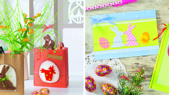 Предлагаем разнообразные идеи простых и оригинальных поделок к Пасхе, которые вы легко сделаете своими руками. Обязательно привлеките к процессу детей, несомненно, они с радостью примут участие в подготовке и непосредственно в работе. Поздравительные открытки к Пасхе Вам потребуется: • дизайнерский картон с фактурой льна цвета листьев липы размером 12 х 17 см • подарочная бумага размером 8,5 х 16 см в светло-зеленую полоску • винно-красный и травянисто-зеленый фотокартон • подарочная бумага в светло-зеленый горошек и в красно-белую клетку • красная сатиновая лента шириной 3 мм и длиной 20 см • светло-зеленая пуговица • белый, зеленый и темно-коричневый акварельные карандаши • черный тонкий маркер Для открытки с пасхальными мотивами: • светло-голубой дизайнерский картон с фактурой льна размером 12 х 17 см • светло-зеленая цветная бумага размером 7,5 х 17 см • картон с мотивами: в сине-белую полоску и в розово-белую клетку, в розовый и голубой горошек, с оранжевым узором • бумажный самоклеящийся кружевной бордюр • лента в сине-белую клетку шириной 5 мм и длиной 35 см Кроме того: • ножницы «зигзаг» • ножницы для бумаги • прозрачный универсальный клей • прозрачный клеевой карандаш • двухсторонние клеевые подушечки • светло-зеленые, синие и винно-красные шелковые нитки для шитья • швейная машина • канцелярский дырокол Открытка с тюльпанами Светло-зеленый картон с фактурой льна сложить в форме двойной открытки, загладить сгиб, затем развернуть и длинный край обрезать ножницами «зигзаг». Левый край открытки в развернутом виде по верхней стороне отстрочить на швейной машине, как показано на фото модели. Вырезать картон в полоску размером 8,5 х 16 см, нижний край обрезать ножницами «зигзаг» и наклеить на открытку. Согласно мотивам, предварительно их увеличив, вырезать винно-красный круг и круг в горошек, а также тюльпан, затем поочередно приклеить. Тюльпан наклеить на вырез с помощью клеевой двухсторонней подушечки. Скопировать надпись и повторить тонким маркером. Открытку оттенить цветными карандашами и вложить внутрь лист для текста. Мотивы для бесплатного скачивания Открытка с пасхальными мотивами Светло-голубой картон с фактурой льна сложить пополам, загладить сгиб и вырезать полоску светло-зеленой цветной бумаги размером 7,5 х 17 см. Мотивы зайцев и яиц соответственно увеличить, перевести на подходящую бумагу и вырезать. Мотивы наклеить клеем на бумагу в полоску и отстрочить на швейной машине по горизонтали, как показано на фото модели. Затем полоску наложить на открытку и наклеить вдоль нижнего края вместе с бумажным бордюром. Второй бордюр обрезать примерно на треть по ширине и наклеить по верхнему краю цветной бумаги. Сначала наклеить ленту в клетку, затем из оставшейся ленты завязать бант и приклеить. Из картона в горошек с помощью дырокола вырезать кружки и, распределив их на открытке, также приклеить. Мотивы для бесплатного скачивания Подарочные пакеты с пасхальными мотивами Вам потребуется: • бумажные пакеты коричневого и красного цвета • светло-зеленая акриловая краска • джутовый шнур диаметром 2,5 см: зеленого цвета длиной 20 см и натурального цвета длиной 30 см • остатки лент темно-красного и коричневого шерстяного флизелина • светло-зеленый фетр толщиной 1 мм • 2 полубусины или булавки с черными головками диаметро