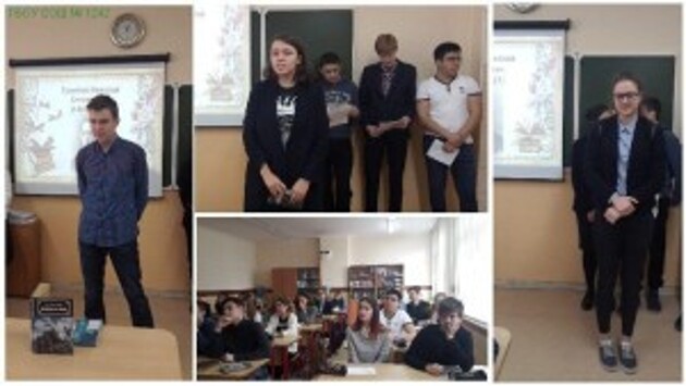 Лекция «Николай Гумилев – поэт серебряного века» прошла для учеников 10 «А» класса школы с углубленным изучением иностранных языков № 1242. На уроке школьники поочередно прочитали стихотворения поэта Николая Гумилева, после чего послушали историю его жизни и обсудили его творчество, а также в целом творчество поэтов серебряного века. Особую атмосферу для поэтического занятия создал романс «Однообразные мелькают все также дни мои…» в исполнении Николая Носкова на стихотворения Гумилева. Поэтическое мероприятие в школе было приурочено ко Дню рождения Гумилева и прошло 18 апреля. Фото: официальный сайт школы №1242.