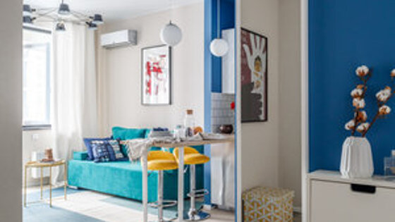 Заказчик купил квартиру в новостройке, чтобы оформить ее для сдачи в аренду. Современный, разносторонний, любящий искусство и дизайн – именно такой образ будущего жильца придумали дизайнеры Марина Новикова и Ольга Льюис. Квартиру площадью чуть больше 40 квадратов можно было бы превратить в студию, но Марина Новикова принципиально против открытых планировок. «Спальня – интимное пространство, им нельзя жертвовать. К тому же в двухкомнатной квартире можно разместить не только хозяев, но и гостей», – комментирует дизайнер. Авторы проекта предположили, что жильцы будут часто принимать гостей, поэтому прихожую, кухню и гостиную объединили в единую общественную зону. Кухню визуально выделили с помощью гипсокартонных перегородок, более низкого потолка и барной стойки. Для отделки выбрали довольно простые материалы. Зону прихожей, кухни и ванной выложили керамогранитом, в жилых помещениях на полу – паркетная доска. Для стен использовали сделанные на заказ обои – как ни странно, это дешевле, чем качественно готовить стены под покраску. По площади гардеробная, примыкающая к спальне, сопоставима с кухней. Помимо одежды и спортивного оборудования, в ней найдется место для раздвижного обеденного стола. Это главное и единственное хранилище в квартире – дизайнеры считают, что шкафы на виду не красят интерьер. Авторы проекта уверены, что квартира с оригинальным дизайном быстрее находит арендатора. Здесь сделали ставку на яркие синие и сине-зеленые оттенки: одну из стен украшает крупный узор в виде цветных стрелок. В гостиной в глаза бросается яркий изумрудно-зеленый диван – именно его обивка и привлекла дизайнеров. В процессе работы к нему добавили желтые стулья, перекликающиеся с яркой отделкой ванной. Дизайнеры не ошиблись: новых жильцов нашли буквально за пару дней. ИКЕА, OBI, Leroy Merlin, Hoff, Zara Home Создайте интерьер с товарами из магазина InMyRoom: