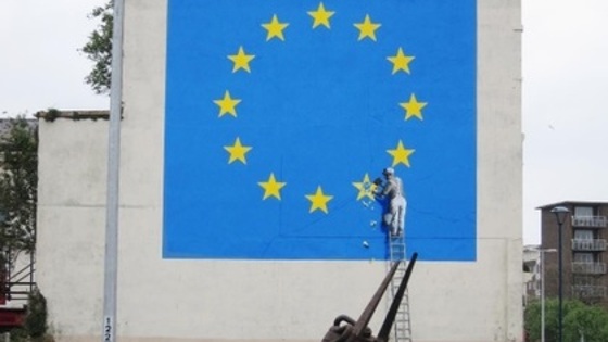 Английский художник в стиле стрит-арт Бэнкси нарисовал в британском городе Дувр на фасаде здания флаг Евросоюза с 11-ю золотыми звездами. Об этом в воскресенье, 7 мая, сообщает газета The Independent. Представители художника подтвердили, что авторство граффити принадлежит ему. Фотографии работы над рисунком опубликованы в Instagram-аккаунте Бэнкси. По информации The Independent, поводом для изображения флага без одной звезды стал затянувшийся Brexit. Решение о выходе Великобритании из ЕС было принято по результатам референдума 23 июня 2016 года. Отказ от членства в Евросоюзе поддержали более половины проголосовавших. 28 марта 2017-го премьер-министр Тереза Мэй подписала письмо с уведомлением властей ЕС о формальном запуске процедуры Brexit. Переговоры об условиях этого процесса займут два года. 3 мая стало известно, что Великобритания отказывается платить за Brexit 100 миллиардов евро. По мнению Франции и Германии, именно столько Соединенное Королевство должно ЕС из расчета взятых на себя долгосрочных финансовых обязательств. Британия готова заплатить не более трех миллиардов. Бэнкси — псевдоним английского андерграундного художника стрит-арта, чья личность не известна. Граффити Бэнкси стали появляться на улицах с начала 1990-х годов. В настоящее время его работы оцениваются в миллионы долларов и значительно увеличивают стоимость недвижимости, на которых размещены, поэтому их порча квалифицируется как вандализм.