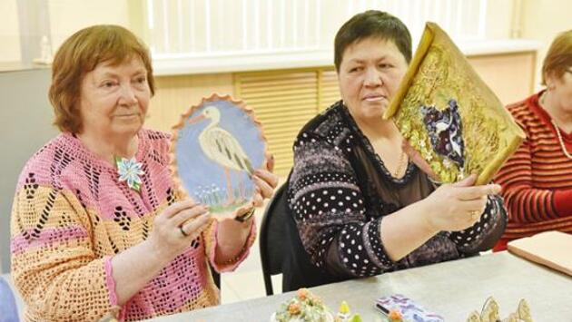 – Я на этих встречах пробую свои силы, – рассказывает 79-летняя Любовь Бекселева. Она показывает настенную карамельно-нежную тарелку с аистом, которую смастерила, и обещает повесить ее на стену. На память. Потом пенсионерка осторожно берет оберег – глиняные колокольчики скромно звенят в Арт-центре, а посетители, перебивая друг друга, рассказывают о своих делах и о том, кому подарят расписанные поделки. Посетители отделения дневного пребывания салехардского социального центра не первый раз пришли в гости к специалисту по сувенирной продукции Любови Богдановой. В прошлый раз эти самые тарелки они лепили, теперь сделали последний штрих – подвязывают им крючки. Кто-то подумывает использовать самодельную тарелку по прямому назначению – и глаз радует, и мыть можно часто, и в микроволновке держать. – Сделали посуду за два часа: слепили из глины и по сырой сразу расписали. Мои посетители – это пожилые люди и инвалиды, – рассказывает Любовь Богданова, мастерица и художник, которая уже двадцать лет занимается таким «самоделием». И отмечает, что глина оказывает целебный эффект на человека любого возраста, успокаивает и гармонизирует. – Не все гости верили в свои силы, а потом даже спрашивали, нет ли в Доме ремесел вакансии художника? Судя по рассказам мастера и по активным живым разговорам за столом, видно, что подобные встречи – не только повод создать что-то своими руками, но и поделиться интересными историями, случившимися за время, пока посетители друг с другом не виделись.