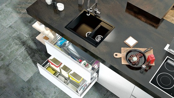 Фото: «Кухонный Двор» Между тем комплексная система организации этого шкафа облегчит работу у воды, а зону вокруг смесителя сделает опрятной. Какие же решения берут на вооружение производители кухонь? Чтобы превратить мойку в рабочий центр, желательно на этапе проектирования кухни не только правильно выбрать мойку и смеситель, но также предусмотреть специальные внутренние элементы для шкафа под ней. Базовый набор включает мусорное ведро, а также приспособления, которые позволяют хранить в удобном доступе, но не на виду моющие средства, мелкие принадлежности для уборки. Расширенная программа включает не просто ведро, а целую систему сортировки мусора, фильтр для очистки воды, реже измельчитель пищевых отходов. Советуем определиться со своими потребностями и возможностями с тем, чтобы подобрать для себя оптимальный комплект специальных внутренних элементов. Систему хранения можно интегрировать в два отдельных ящика или спрятать за одним высоким гладким фасадом. Фото: Blanco Какие варианты систем мусоросборников предлагают сегодня ведущие производители фурнитуры? Систем, позволяющих рационально использовать полезный объём любого шкафа, немало. Прежде всего они различаются по способу крепления: к дверце, днищу корпуса, боковым стенкам и днищу выдвижного ящика. Крепление к дверце Пожалуй, самая бюджетная (от 2200 руб.) конструкция, обеспечивающая быстрый доступ к мусоросборнику, — устанавливается на распашной дверце шкафа, включает одно или два ведра. Удобнее и гигиеничнее вариант с крышкой, которая при открывании дверцы приподнимается, а при закрывании опускается, плотно прилегая к ведру. Для уборки шкафа всю систему можно без труда вынуть. Практический совет Обратите внимание на качество пластмассы, из которого сделаны вёдра. Гладкие внутренние стенки облегчают процесс очистки. Крепление к днищу шкафа Эта универсальная выдвижная система для сортировки мусора подходит для шкафов с распашной дверцей — на одно-два ведра в комплекте. Шариковые телескопические направляющие, интегрированные в систему, обеспечивают полное её выдвижение. При закрытии контейнеры закатываются под неподвижную крышку из пластика, которая может использоваться как полка для хранения чистящих средств и необходимых мелочей. В монтаже не задействованы боковины корпуса. В оставшееся место можно поместить бутылочницу, складную лестницу или иной элемент для хранения, в том числе с креплением на дверцу (комбинированный вариант). Выдвижная система на два ведра (с креплением к днищу) Vibo, Blanco стоит от 3700 руб. На раме выдвижного ящика. Конструктивной простотой, практичностью и удобством отличается система, основанная на стандартном выдвижном ящике, оснащённом несущей рамой, которая удерживает мусорные контейнеры (от двух до четырёх). Доводчик обеспечивает удобное и бесшумное движение системы. Металлическая пластина — крышка, из-под которой система выдвигается, может использоваться как полка. Подобные системы, например Vauth-Sagel, стоят от 8 тыс. руб. ОБРАТИТЕ ВНИМАНИЕ Возникает вопрос: а нужна ли нам система из четырёх контейнеров, ведь, в отличие от европейцев, сортировать мусор у нас пока не принято. Наши соотечественники находят дополнительным контейнерам под мойкой иное применение, например использовать как место хранения бытовой химии, всевозможно