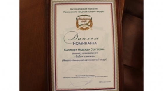 Ямальская писательница Надежда Салиндер стала номинантом литературной премии Уральского федерального округа с книгой «Бубен шамана». Сегодня, 9 июня, в Екатеринбурге состоялось торжественное награждение лауреатов и номинантов премии. Приветствуя участников, полномочный представитель президента РФ в УрФО Игорь Холманских отметил, что церемонию подведения итогов премии в этом году приурочили ко Дню России. Он поздравил присутствующих с наступающим праздником, пожелал им счастья, здоровья и творческих успехов. По традиции претенденты на литературную премию состязались в четырех номинациях: проза, поэзия, литература и критика. На конкурс представили работы более тридцати авторов из десяти регионов России, а также Германии и Белоруссии. Среди них есть как признанные мастера, так и начинающие литераторы. По словам полпреда, произведения, представленные на литературный конкурс, отличаются не только глубоким содержанием, но и безупречным стилем. В короткий список вошли одиннадцать участников. Пять соискателей стали лауреатами премии, три автора - номинантами, еще троих отметили специальными номинациями. На церемонию награждения представительница Ямала Надежда Салиндер приехать не смогла. Диплом ей передадут сотрудники представительства ЯНАО в Екатеринбурге. Как рассказал журналистам сопредседатель жюри премии, сопредседатель правления Союза писателей России Александр Кердан, Надежда Салиндер – человек самобытный и уникальный. Её работа очень понравилась членам жюри, она рассказывает о жизни коренных народов Ямала. «Сложно пересказать сюжетную линию, книгу «Бубен шамана» надо читать, там заложена очень глубокая жизненная философия. Надежда Салиндер пишет о том, что знает о своем народе, о своей судьбе и о людях, которые её окружают», - отметил Александр Кердан. Он также сообщил, что книгу ямальской писательницы «Бубен шамана» выдвинут на соискание Всероссийской литературной премии имени Мамина-Сибиряка, вручение которой состоится в ноябре в поселке Висим Свердловской области.