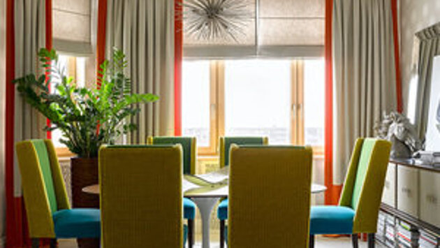 Когда дизайнер — сам себе заказчик, а единственный и главный критик проекта — муж дизайнера, можно ждать интересного результата. То есть игры с пространством, цветом и светом, изящных решений, необязательно практичных. И всяческих «фишек». В этом интерьере главная «фишка», как говорит Марина Жукова, то, что он собирался как пазл. Многие предметы были куплены в европейских и американских интернет-магазинах. Сначала поиск был вынужденным – на российском рынке либо не было того, что хотела Марина, либо цена была в два-три раза выше, чем в стране происхождения. Потом добавился азарт кладоискателя: найти то, чего ни у кого больше нет. Еще одна особенность — обилие хорошей живописи. «Мои дедушка и мама художники, поэтому тяга к живописи у меня с детства, — рассказывает Марина. — Мое первое образование — историк искусства, искусствовед. Я люблю современную российскую живопись, в моей «коллекции» много таких работ». Обычно для коллекции живописи стараются подобрать нейтральный фон, чаще всего светлый, в крайнем случае — какой-нибудь размытый, припыленный цвет, оливковый или синий, но в этом интерьере живопись вписана в орнаменты и цветовые композиции так, что составляет с ними единое целое. Конечно же, цвет — главная фишка проекта. Голубая кухня с желтыми пятнами картин и синими шторами с оранжевой отделкой, гостиная, где яркие стулья обиты тканями трех цветов — бирюза, светло-зеленый и горчичный, а в отделке штор и рисунке ковра опять появляется оранжевый. И кабинет, где в ярком панно собраны все цвета спектра. При таком буйстве красок на стенах пол может быть только светлым, нейтральным, поэтому Марина выбелила дубовый паркет, но так, чтобы была видна фактура дерева. В отделке использованы натуральные материалы — дуб, мрамор, оникс. Марина говорит, что они благородно стареют. Но есть и продукты новых технологий. Кухонная столешница и фартук, например, выполнены из кориана — его небесно-голубой цвет поддерживает цвет обоев на стенах. Длинная столешница в хозяйской ванной сделана из искусственного камня Staron черного цвета с вкраплениями желтого. Планировка квартиры обусловлена расположением окон. Часть из них выходят на проспект Вернадского — здесь расположились гостиная, кухня и кабинет. Часть — во двор: это спальня и детская. Хозяйская спальня сделана, как отдельная квартира со своим санузлом и отдельно стоящей ванной, которая никак не огорожена от спальни. При входе есть гардеробная. Марина говорит, что это позволяет избежать беспорядка. Даже если кто-то бросил свои вещи (а это обычно так и случается), за пределами гардеробной беспорядка нет. В каждой комнате предусмотрены вместительные шкафы, сделанные на заказ по авторским эскизам. В кабинете встроенный шкаф для книг совмещен с местом для чтения — лежанкой вдоль окна, на которой приятно устроиться с книжкой на пару часов. Хотя для востребованного дизайнера это, наверное, скорее мечта. Холл Отделка: обои, Thibaut, Geometric recourse; краска, Benjamin Moore Напольное покрытие: мраморная плитка, Marmocer Декор: зеркала, Louvre Home Гостиная Отделка: обои, Cole & Son, Contemporary Restyled Напольное покрытие: крашеный дубовый паркет Мебель: стол, Tulip; диван, Westley Hall; стулья куплены на Amazon, переобиты в Москве, ткань Designers Guild Ковер: Global Views Текстиль: Harlequin, Gaston y Daniela, мастерская «Артик» Освещение: люстра, Arteriorios; светильники, Modular Bolster Сп