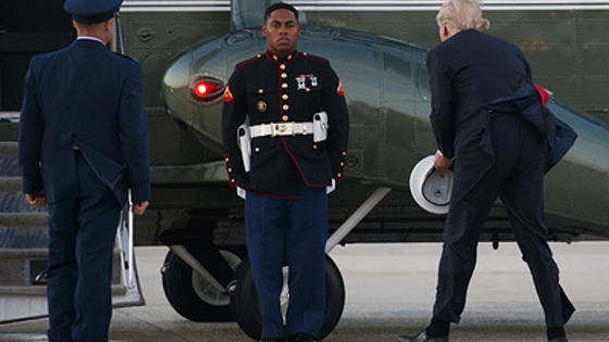 В Сети набирает популярность видео с президентом США Дональдом Трампом, который помогает поймать фуражку военному. Об этом сообщает РИА Новости. Лидер Соединенных Штатов подходил к борту вертолета Корпуса американской морской пехоты США, когда увидел, что у одного из солдат ветер сорвал с головы фуражку. Солдат между тем не двигался по регламенту. Президент поднял фуражку и вернул ее военному. Однако головной убор снова улетел, и Трампу пришлось повторно поднять его. В итоге президент США похлопал военного по плечу и поднялся на борт вертолета. Большинство американцев одобрили попытку президента помочь солдату.