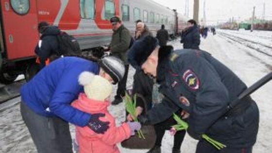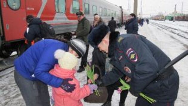Транспортные полицейские дарили женщинам цветы на вокзале «Рязань-2»