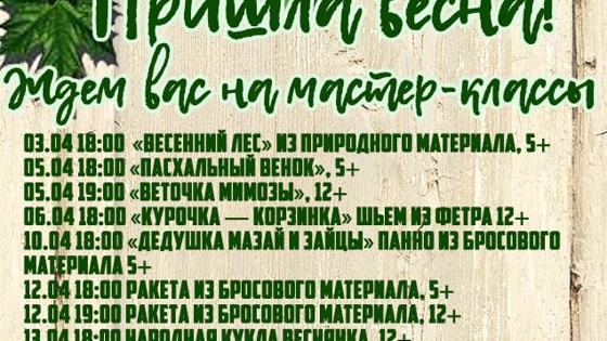 Пришла весна — самое вдохновенное и творческое время года! Досуговый центр ГБУ «М КЛУБ» приглашает всех желающих посетить бесплатные мастер-классы в корпусе 1455. Вместе с мастерицей Натальей Самсоновой каждые апрельские вторник, четверг и пятницу дети и взрослые будут создавать эксклюзивные весенние игрушки и сувениры. 03.04 18:00 «Весенний лес» из природного материала, 5+ 05.04 18:00 «Пасхальный венок», 5+ 05.04 19:00 «Веточка мимозы», 12+ 06.04 18:00 «Курочка — корзинка» шьем из фетра 12+ 10.04 18:00 «Дедушка Мазай и зайцы» панно из бросового материала 5+ 12.04 18:00 Ракета из бросового материала, 5+ 12.04 19:00 Ракета из бросового материала, 12+ 13.04 18:00 Народная кукла Веснянка, 12+ 17.04 18:00 Вазочка, 5+ 19.04 18:00 Интерьерное украшение «Первая ласточка», 5+ 19.04 19:00 Сувенир «Скворечник», 12+ 20.04 18:00 Интерьерное украшение «Веточка с птичками», 12+ 24.04 18:00 Прилетели бабочки, 5+ 26.04 18:00 Объемная открытка «Весенняя клумба», 5+ 26.04 19:00 Букет гиацинтов, 12+ 27.04 18:00 Майская голубка, 12+ Продолжительность занятий 45-60 минут. К мастер-классам можно присоединиться по предварительной записи по телефону 8(499)729-29-41. Все мастер-классы абсолютно бесплатны. Не забудьте сменную обувь или бахилы!
