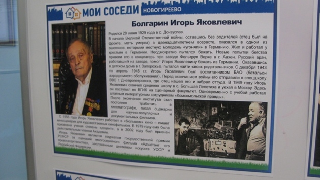 Стенды выставки «Мои соседи» жители района Новогиреево увидели в школах, где располагались избирательные участки. Выставка «Мои соседи» была инициирована ЦБС ВАО. За довольно короткий срок библиотеки Восточного округа сумели собрать информацию об интересных людях, проживающих в районе, и подготовить стенды, чтобы познакомить новогиреевцев друг с другом. Вся информация получена от новогиреевцев, которые захотели рассказать о том, какие замечательные и интересные личности живут рядом с нами, по соседству. Так, в помещении Технологического колледжа № 24 на Полимерной улице, жители района, пришедшие голосовать, увидели стенд, на котором были размещены фотографии и информация о шести жителях нашего района: художнике-карикатуристе Владимире Солдатове, Игоре Болгарине, Елене Ненароковой, Игоре Мурзенко, Григории Лущике и Елене Кругловой. Фото – Александр Калугин.