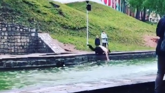 В паблике «Злой кировчанин» подписчик опубликовал видео, на котором мужчина пытается потрогать воду на температуру в фонтане в сквере 60-летия СССР. https://scontent-arn2-1.cdninstagram.com/vp/865883a1c14e4cb30d152095bfbc5df0/5B238740/t50.2886-16/34143640_313860122717326_8717560885230436352_n.mp4 Однако координация его подводит и он падает в воду. Фото – скриншот видео «Злой Кировчанин»