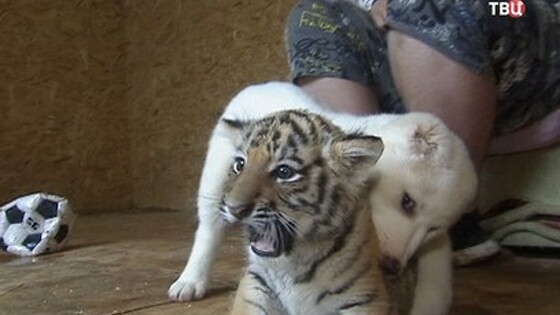 У друзей - время завтрака. В меню двухмесячного алабая - собачий корм, а у маленького хищника - парная телятина. Кормление проходит под присмотром ветеринара, который следит за здоровьем малышей, передает "ТВ Центр". Тигренок родился в крымском сафари-парке "Тайган". В честь него хищник и получил свою кличку. В Приморье самца амурского тигра отправили с важной миссией. Он должен помочь в восстановлении популяции. Сегодня, по сведениям Всемирного фонда дикой природы, на воле осталось чуть более 500 амурских тигров. А пока Тайган беззаботный котенок. Уже научился есть из бутылочки. Мясо Тайгану дают пока в качестве прикорма. Его основной рациона остается молоко, дают козье. В нем содержатся все необходимые питательные вещества, максимально приближенные к кошачьему молоку. Вместе с алабаем Дели тигренок Тайган проводит все свое время. Это далеко не первый случай, когда в зоопарке именно собака помогает расти хищной кошке. Они практически одного возраста. Потому полосатый зверь не соперничает, а наоборот, все повторяет за дружелюбным псом. Если собака сидит на руках у человека, то и тигр пойдет. Так хищника приучают к людям. "Он не отходит от человека, очень ласковый. Видите, он ушел, вроде как крутой тигр, но вернулся, как домашний котенок и лег на руки. В этом весь он, вроде бы вспыльчивый, но при этом человекозависимый", - рассказал ветеринарный врач зоопарка "Садгород" Виктор Агафонов. У малышей один на двоих вольер, общие игрушки и миски. Но через два года друзей придется разлучить. Тайгану предстоит познакомиться уже с тигриной семьей, а позже и создать свою. Ольга Скрипникова, "ТВ Центр", Владивосток.