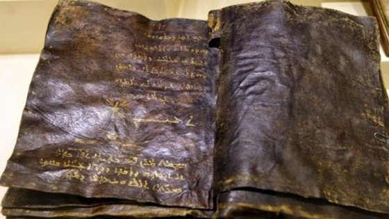 Золотые (в прямом смысле) буквы нанесены на страницы из тонко выделанной кожи. Библия написана на ассирийском языке — это Евангелие от ученика Христа, Варнавы.