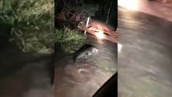 В Северной Австралии двое возвращавшихся ночью домой рабочих, сняли на видео крокодила, который расположился на проезжей части и с неохотой покинул ее после криков и сигналов, сообщает телеканал "360". Рептилия с комфортом устроилась в огромной луже и ушла с грунтовой дороги только после того, как мужчины подняли шум и заставили ее убраться в лес. "Я почти уверен, что он был так же удивлен, увидев нас, как мы — его", — заявил автор видео.