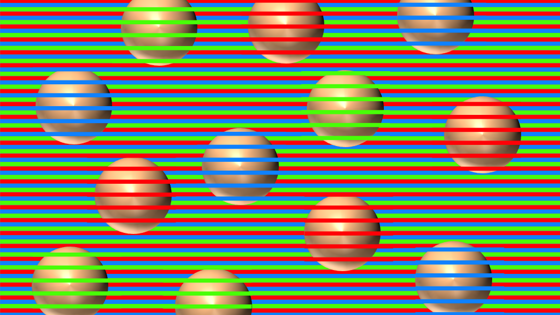 На картинке изображены шарики и разноцветные полоски. При первом взгляде кажется, что все шарики разных цветов, но, если приглядеться, все они коричневые.