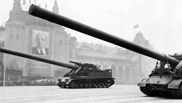 «Ядерный» миномет 2Б1 «Ока» на гусеничном ходу, вопреки мнениям некоторых историков, был (ненадолго) принят на вооружение Советской Армии и даже неоднократно принимал участие в парадах военной техники на Красной площади.