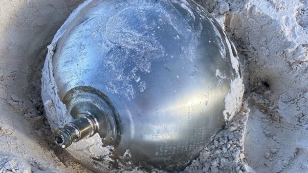 Туристка обнаружила шар в песке на пляже острова Харбор. На объекте написано, что он имеет диапазон рабочих температур от минус 170 градусов Цельсия до минус 196 градусов Цельсия, его объем — 43 литра, а вес — 41 килограмм.