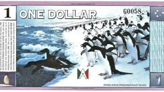 Один антарктический доллар. Неофициальная валюта. Купюры выпускались с 1996 по 2001 год.
