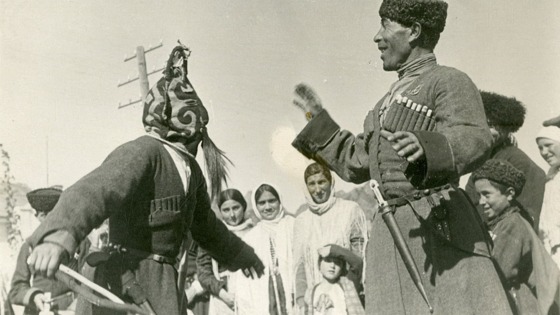 Сюжет фотографии на первый взгляд легко принять за фиксацию традиционного обряда. Но обратите внимание: дело происходит не в поле, а в Карт-Джурте, большом поселении, почти городе для сельских жителей. Это плановый праздник, организованный колхозом, с обязательным выступлением председателя, секретаря парткома и передовиков производства, с песнями и плясками, а ритуал сжался до номера художественной самодеятельности, потеряв свое былое значение и смысл. Легализованный обряд лишился сакральности, а воин в маске превратился в клоуна. Если раньше поединок, который мы видим на фото, проводился для того, чтобы выявить человека, который более удачлив в работе, на которого нужно делать ставку, то сейчас это просто развлечение, аттракцион для увеселения публики, элемент масскультуры.